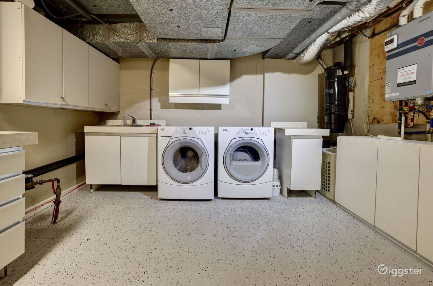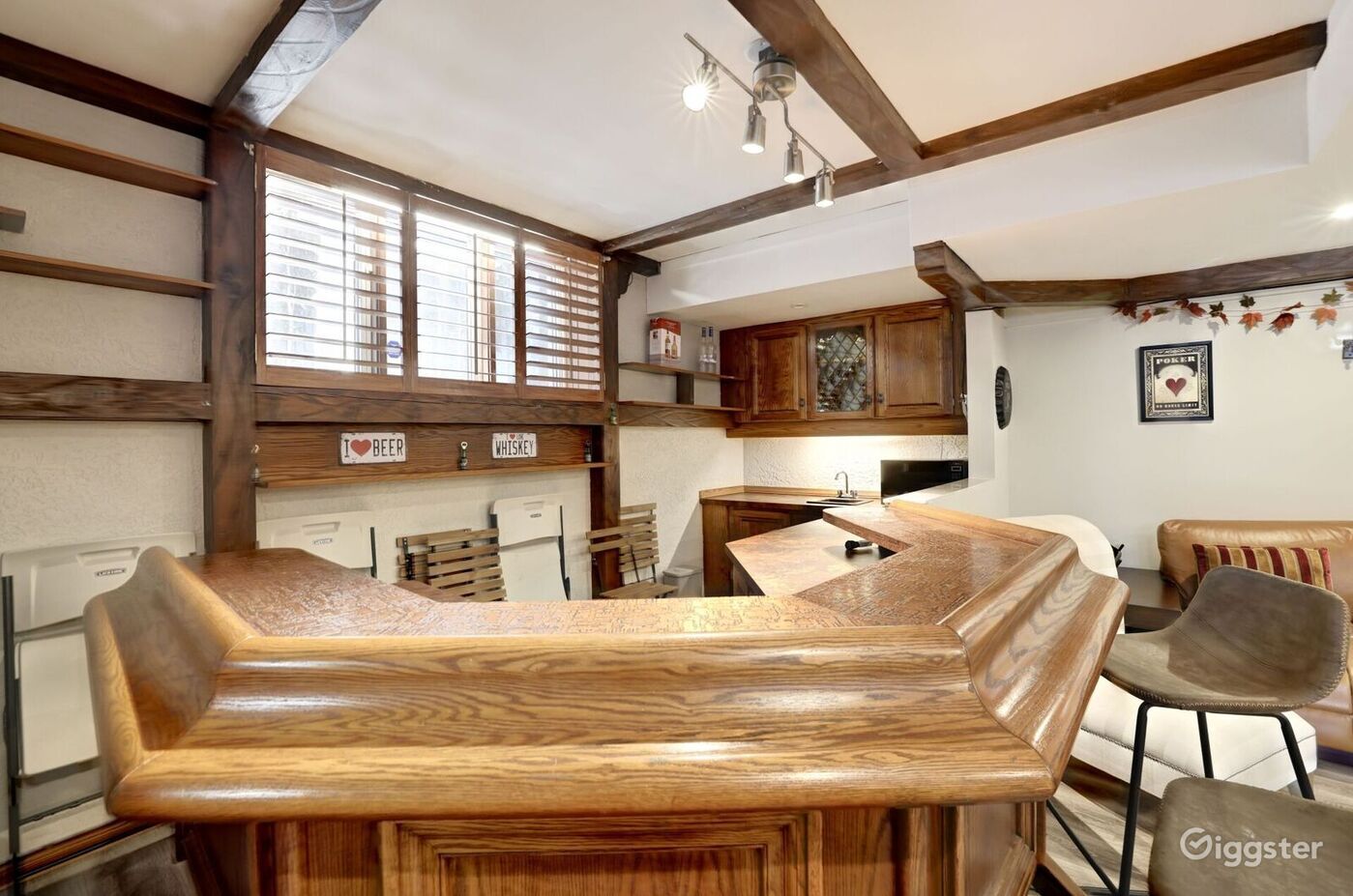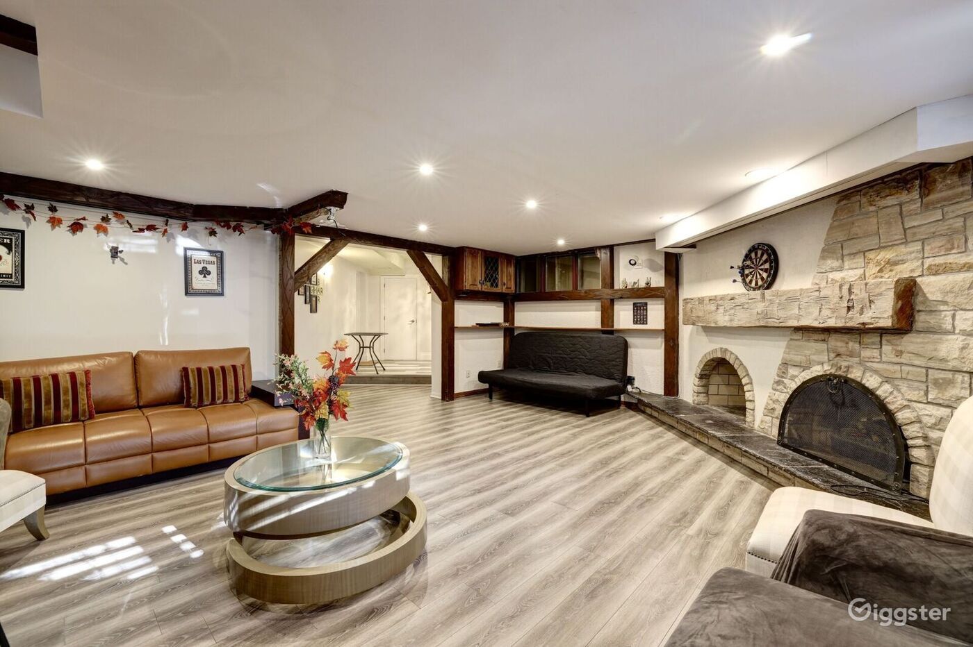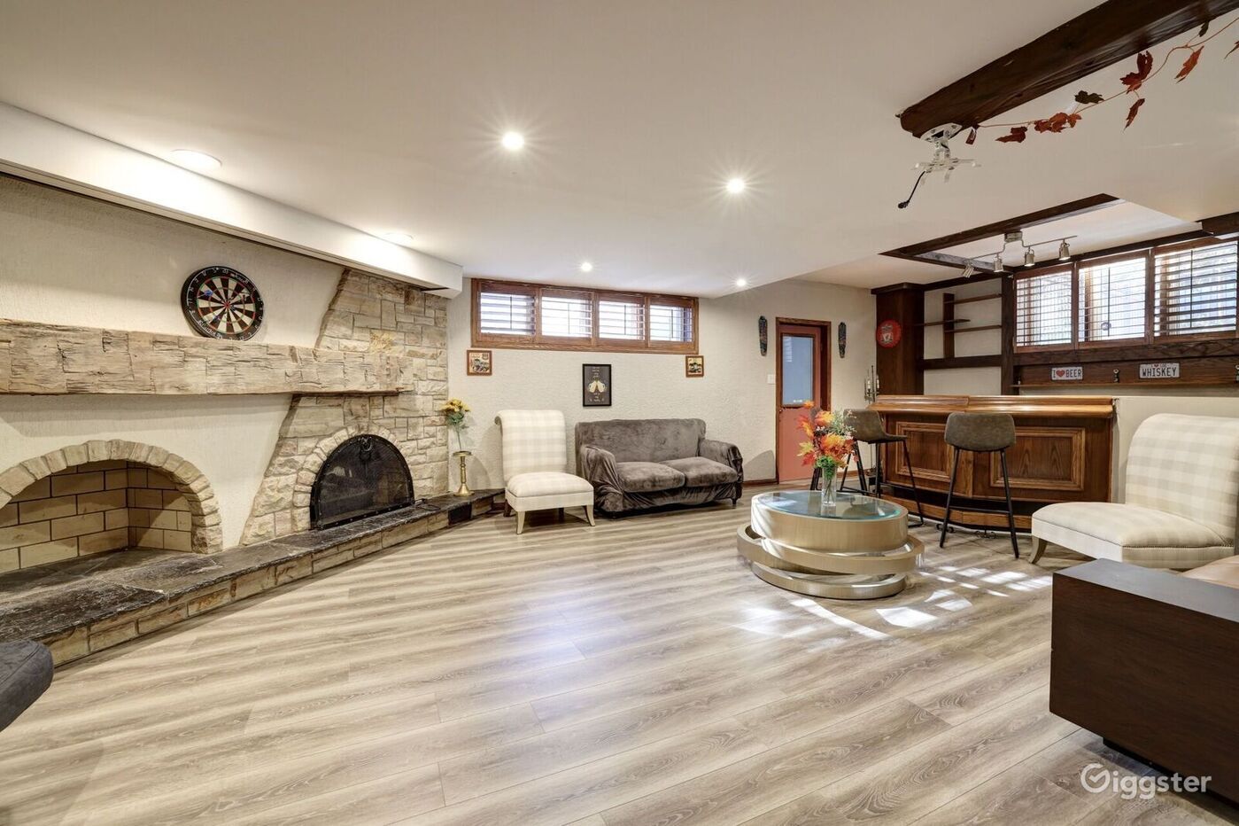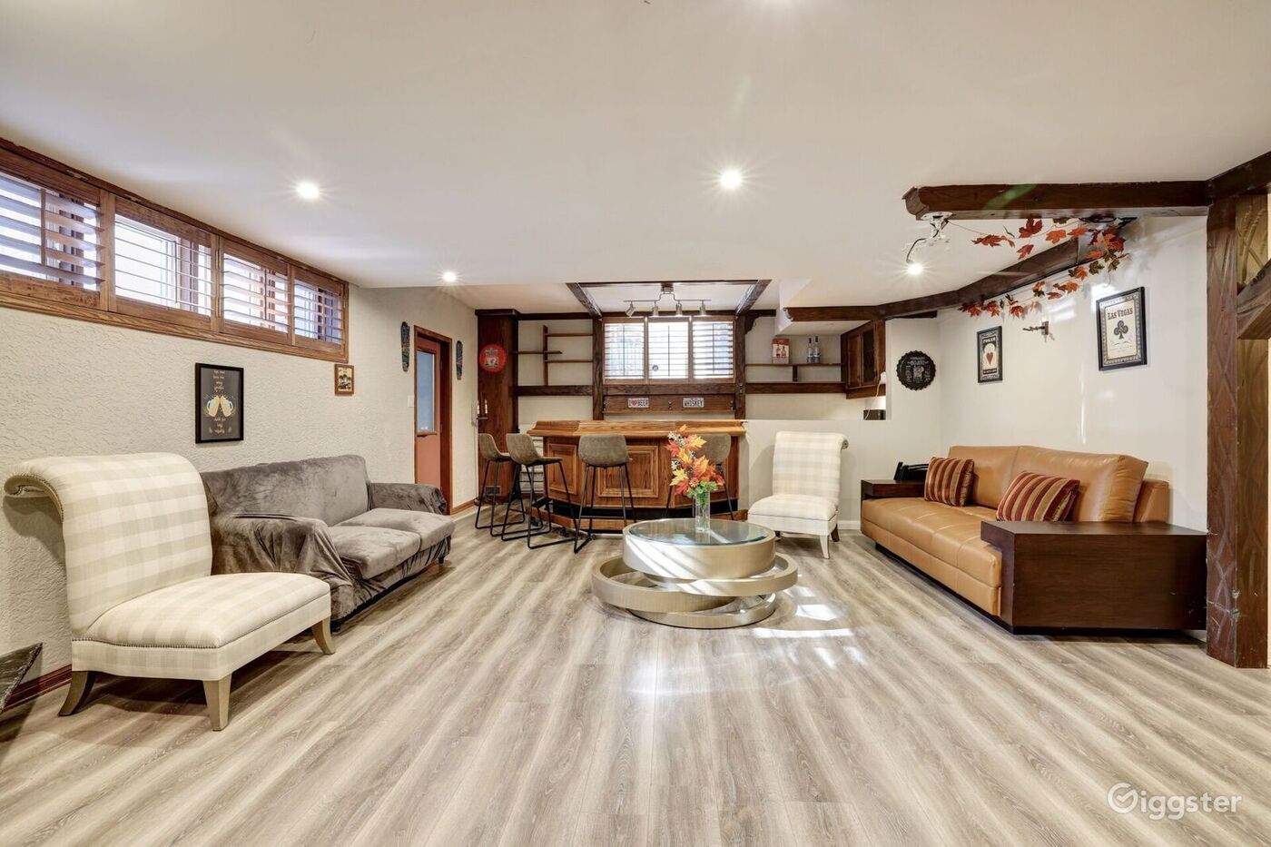 The basement is designed for entertainment, featuring a bonus sofa bed for additional seating, a bar for drinks, and ample space to enjoy.