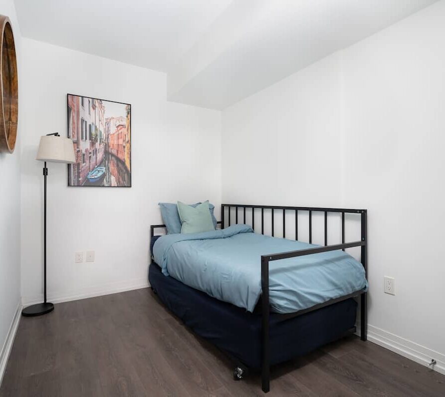 Adjacent to the living area, you’ll find a spacious queen bed, adorned with soft linens and plush pillows, promising a restful night’s sleep. With ample natural light streaming through the windows, wake up feeling rejuvenated and ready to explore the city.